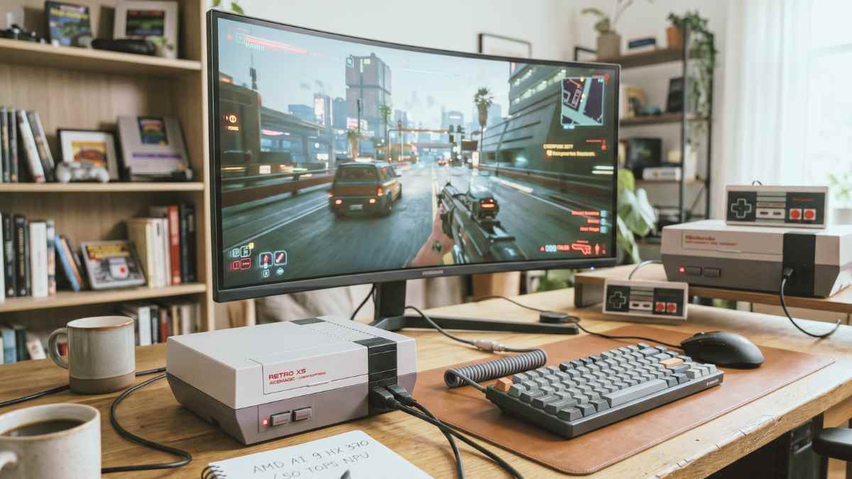 Osservando i dettagli tecnici, si nota come l’integrazione di memorie LPDDR5X e il supporto allo standard PCIe 5.0 per l’archiviazione rendano i tempi di caricamento praticamente impercettibili. Curiosamente, lo chassis include piccoli dettagli che richiamano i controller originali, ma sul retro la dotazione è modernissima: porte USB4 da 40Gbps e connettività multi-monitor in 8K. Un particolare quasi maniacale riguarda le prese d’aria, strategicamente nascoste tra le fessure del design anni ’80 per mantenere un profilo termico ottimale senza sacrificare l’estetica “brick”.